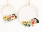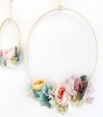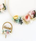 Está formado por un aro de madera y decorado con flores de tela, secas y preservadas. Pompones hechos a mano en nuestro taller. Elige el tip de colgador que más te guste.
